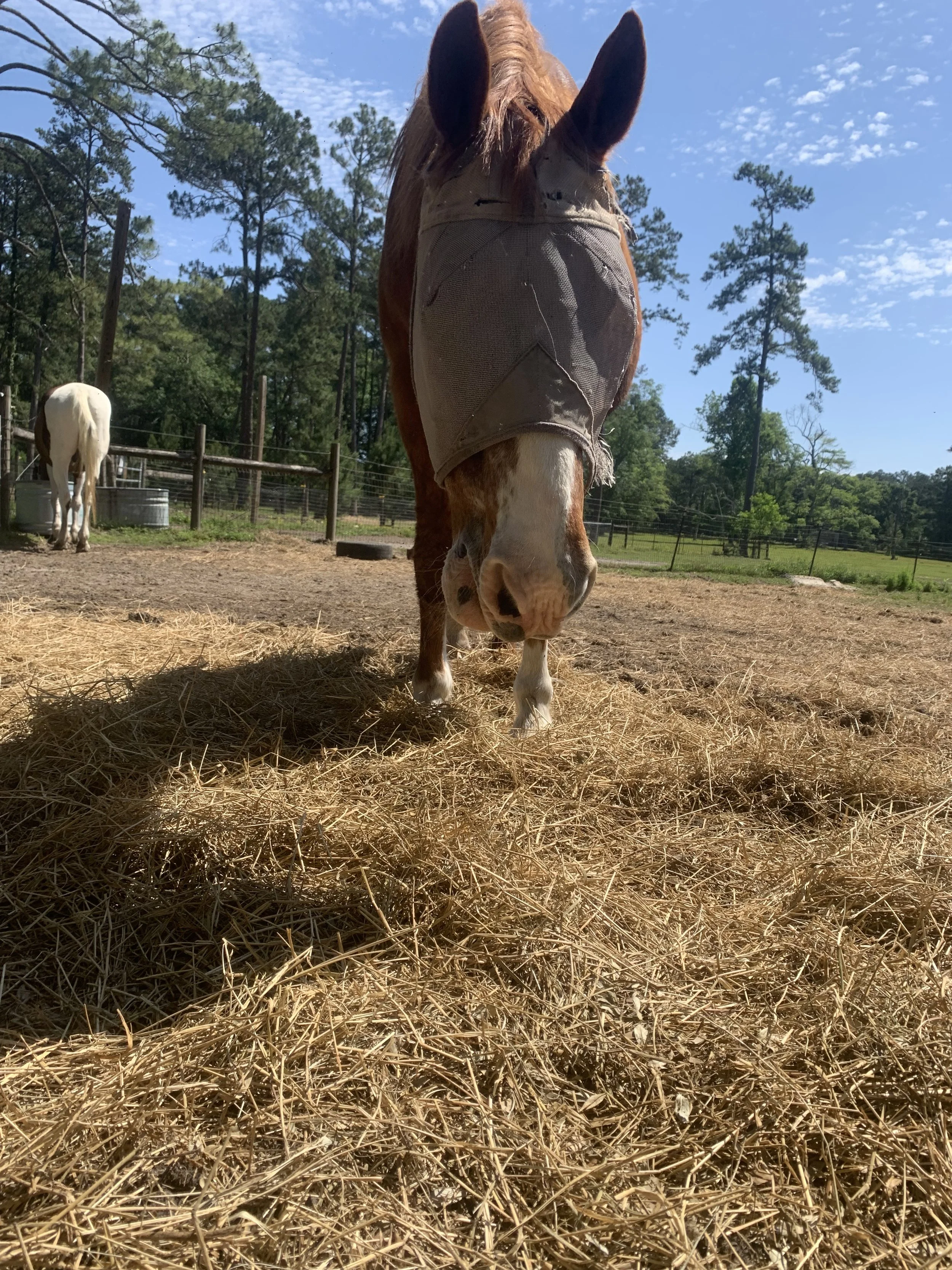 Did you know loyal readers, that horses are foragers? Since we are naturally grazing animals, we have to have forage in our diets to maintain our health! In fact, our digestive tract was designed to use forage as the main component of our diet! Myself, and my fellow herd mates get to eat hay twice a day, in addition to our meals, to help make sure our nutritional needs are met! Horses are supposed to eat about 2% of their body weight in hay each day! With all of the horses here at Hands and Hearts for Horses weighing in at over 1000 lbs, you can imagine that this adds up!